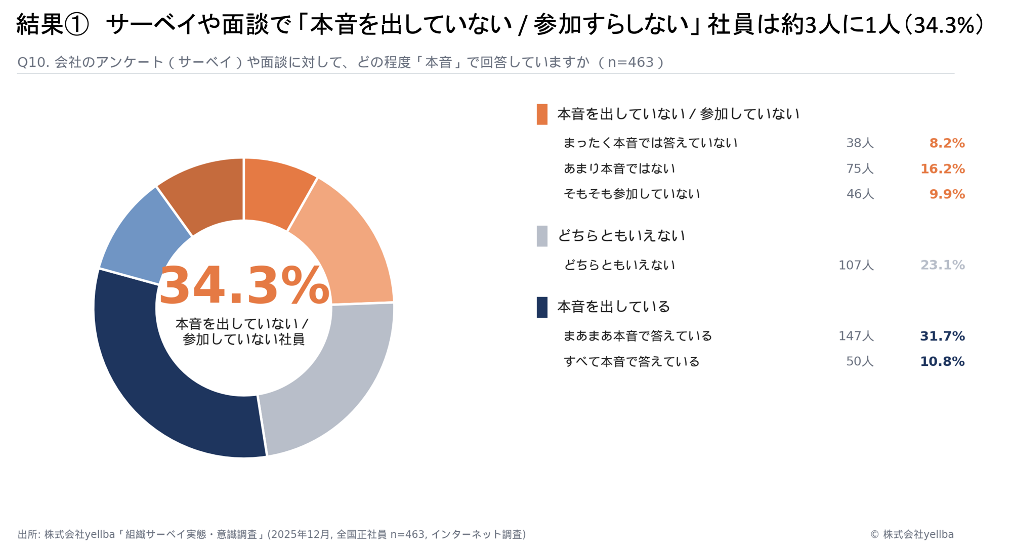 組織改善プラットフォームを提供する株式会社yellba(本社:東京都港区、代表取締役:西川 和範)は、全国の正社員463名を対象に「社員の声と組織に関する意識」に関するインターネット調査を実施しました 。