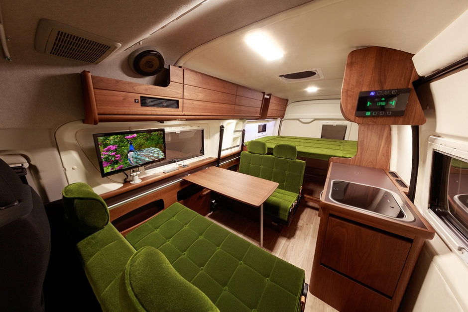 また、シートおよびベッドには耐摩耗性に優れたモケット生地を使用。ビロードのような上質な肌さわりを持つ、特徴あるモケット生地は、乗用車に求められる難燃証明も取得しています。
