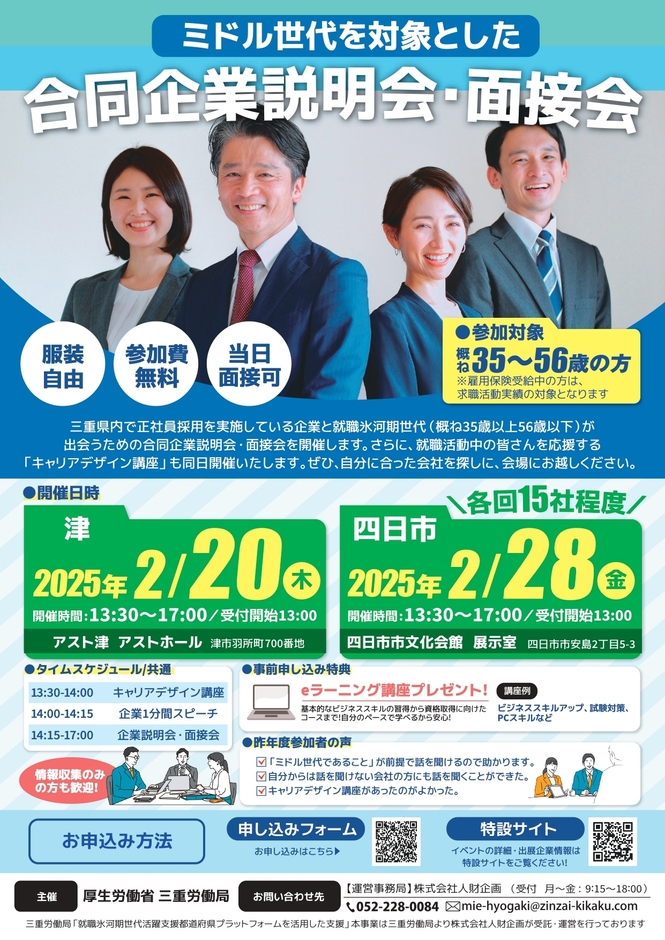 三重労働局イベント事務局(※受託・運営:株式会社人財企画)は、令和6年度就職氷河期世代活躍支援都道府県プラットフォームを活用した支援の一環として下記の通り合同企業説明会・面接会を開催いたします。