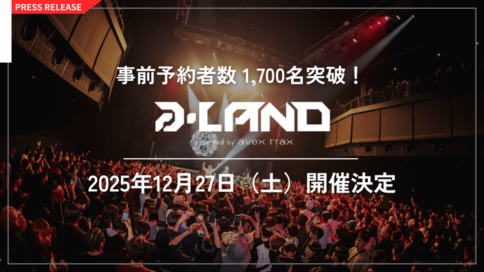a-LAND〈エーランド〉 supported by avex trax in Zepp Shinjuku は 12月27日(土) に開催が決定!第10回という節目を記念し、過去最大規模となる 「大忘年祭」スペシャル として実施します。また、事前予約者数が1,819名の事前予約を達成しました。Z世代が一堂に会する大注目の年末イベントをお楽しみください。新たな出演者や特別演出など、詳細は公式SNSにて随時発表予定です。