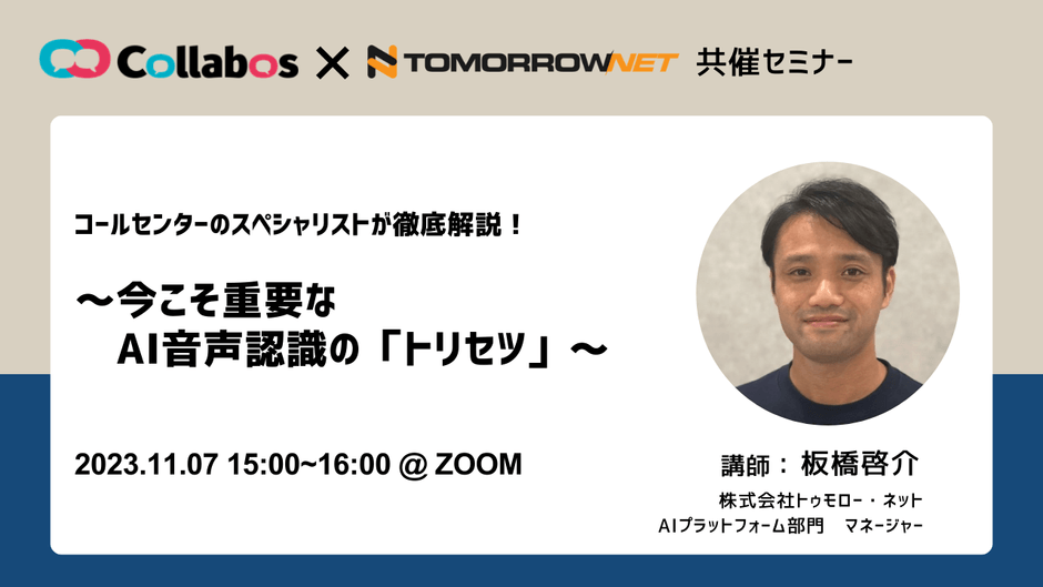 トゥモロー・ネット、販売パートナーのコラボスと共催で コールセンター向け“AI音声認識”の活用に関する オンラインセミナーを11/7(火)に開催