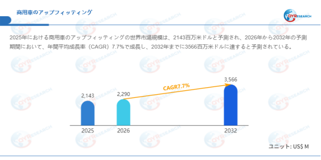QYResearchが発表した新たな市場調査レポート「商用車のアップフィッティング―グローバル市場シェアとランキング、全体の売上と需要予測、2026~2032」によると、世界の商用車のアップフィッティング市場規模は2025年の約2143百万米ドルから2026年の2290百万米ドルへと順調に拡大すると見込まれ、予測期間中は年平均成長率(CAGR)7.7%で成長し、2032年には3566百万米ドルに達すると予測されている。
