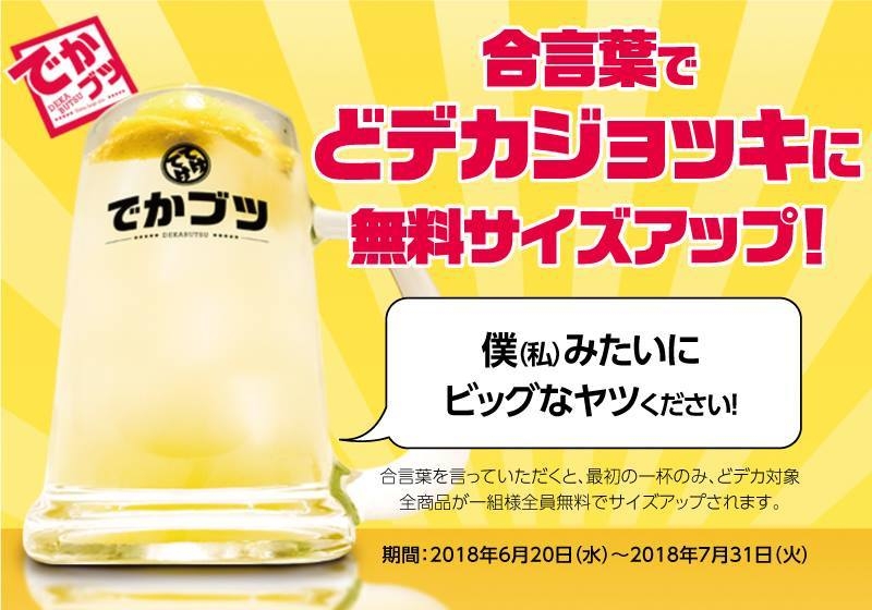 ご来店時もしくはご注文時に合言葉を言っていただけると、最初の1杯のみ、どデカ対象全商品が一組様全員無料でサイズアップされます。