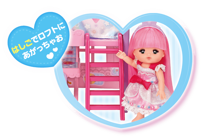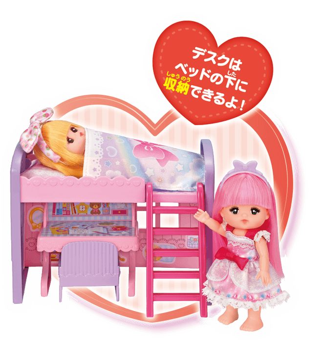 ポケットメルちゃんシリーズに「ベッド&デスクセット」が新登場。デスクに座っておべんきょうしたり、ロフトベッドでおねんね遊びができるセットです。ロフトベッドにははしごをかけて上がれます。かわいいまくらとふとんも付いています。デスクをベッドの下に収納したり、模様替えを楽しめます!ポケットメルちゃんといっしょにごっご遊びを楽しんでくださいね。