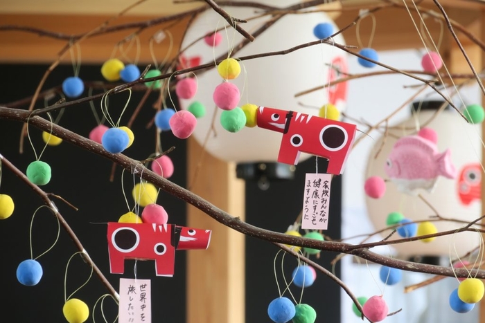 会津では冬になると、木に色とりどりの団子や縁起物を飾り、家内安全や無病息災を願う「団子さし」という行事が行われます。イベント会場は、この団子さしをイメージし、団子や白く染まった赤べこを吊るした木を設置。会場にはペーパークラフトの赤べこと短冊を用意し、ゲスト自身で赤べこを作り短冊に今年の抱負を書きます。作った赤べこと短冊は木に飾り付け、団子さしの木にゲストの作った赤べこが仲間入りします。