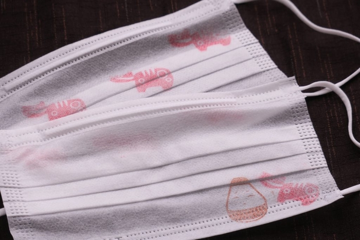 ホテルの滞在中も赤べこを常に身に着けられるよう、赤べこをあしらったオリジナルマスク作りをおこないます。郷土玩具の赤べこや起き上がり小法師のスタンプで、不織布のマスクに絵柄をつけていきます。自分好みの色や絵柄で楽しくマスクをデコレーションできます。