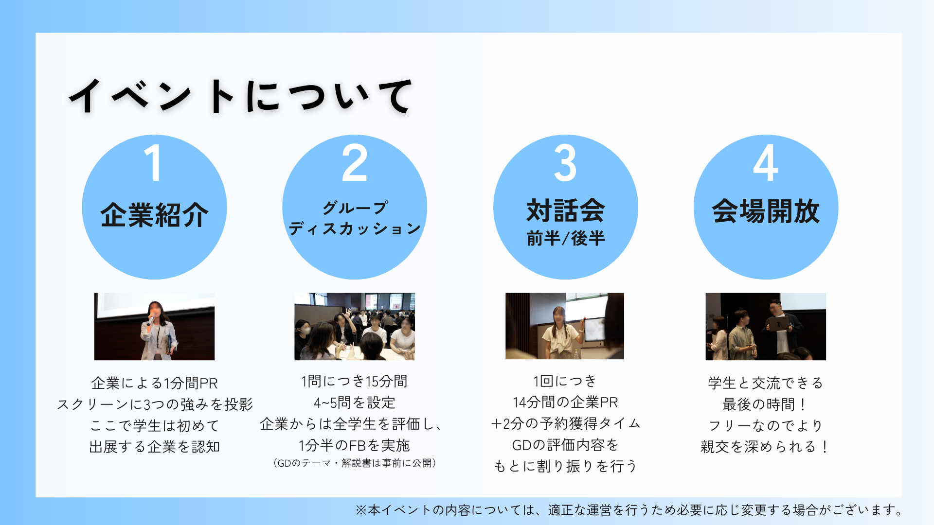 本サービスは、対面型グループディスカッション(GD)を中心とした就活イベントで、学生が“自分らしく能力を発揮できる場”を提供するとともに、企業にとっては“優秀学生との接点”及び、“非認知能力(協働力・主体性・人柄・論理性)を見極められる機会”を創出してまいります。