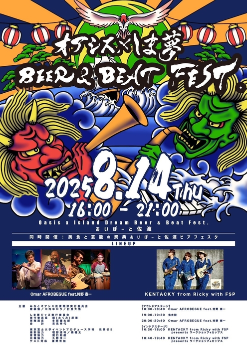 東京から最短3時間半の距離にありながら、壮大な自然と独自の文化を有する“遠くて近い世界遺産の島”佐渡で、音楽と伝統芸能、地域の魅力を融合した一日限りの特別な夏フェス「オアシス×しま夢 BEER & BEAT FEST.2025」(実行委員長:能 厚準)が開催されます。