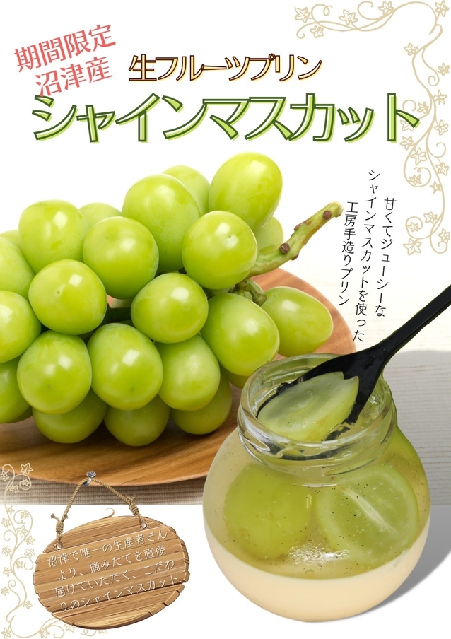 「“沼津産”シャインマスカット」は、沼津で唯一シャインマスカットを生産している農家さんから摘みたてのマスカットを直接仕入れ、惜しげもなく贅沢に使ったこだわりプリンです。収穫時期が短く、今の時期だけの特別なプリンを24時間いつでも自動販売機なら購入いただけます。