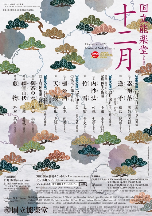 国立能楽堂(東京都渋谷区千駄ヶ谷4-18-1)の12月主催公演が下記の通り上演されます。