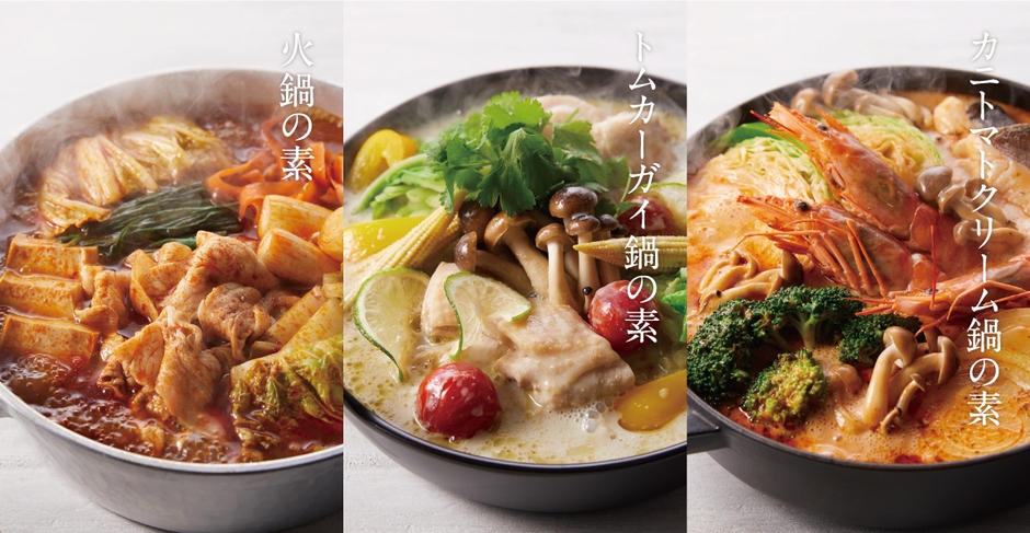 変わり種の鍋、「火鍋の素」「トムカーガイ鍋の素」「カニトマトクリーム鍋の素」