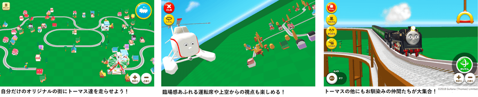 本アプリは、お子さまに大人気のキャラクター「きかんしゃトーマス」を起用し、自分で作ったオリジナルの線路にトーマスを走らせることが出来るゲームアプリです。小さいお子さま向けの「かんたんモード」では、画面を指でなぞるだけという簡単操作で線路を作って楽しむことが出来るほか、「じっくりモード」では線路の分岐や高架橋といったアイテムや、周りにオブジェを配置して自分だけの街を作り出せるなどのカスタム要素も盛り込んでおり、保護者も一緒に遊ぶことで親子のコミュニケーションを促すと同時に、幅広い年齢層のお子さまを対象に、ゲーム感覚で楽しみながら自由な発想力や創造力、空間認識力を養います。