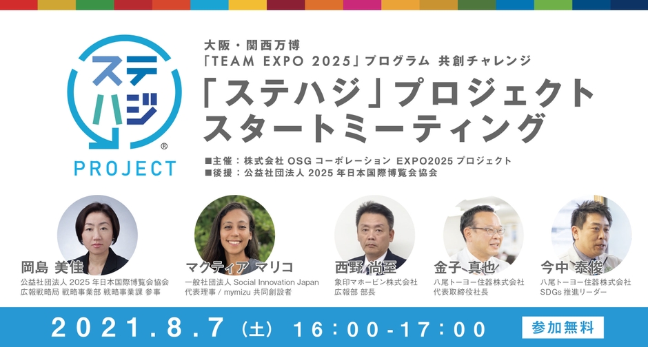 機能水総合メーカー株式会社OSGコーポレーション(所在地:大阪市北区、代表取締役社長:山田 啓輔)は、2021年8月7日(土)16:00-17:00(約1時間)、公益社団法人2025年日本国際博覧会協会を後援に迎え大阪・関西万博「TEAM EXPO 2025」プログラム/共創チャレンジ第1回「ステハジ」プロジェクトスタートミーティングのオンラインイベントを開催しました。