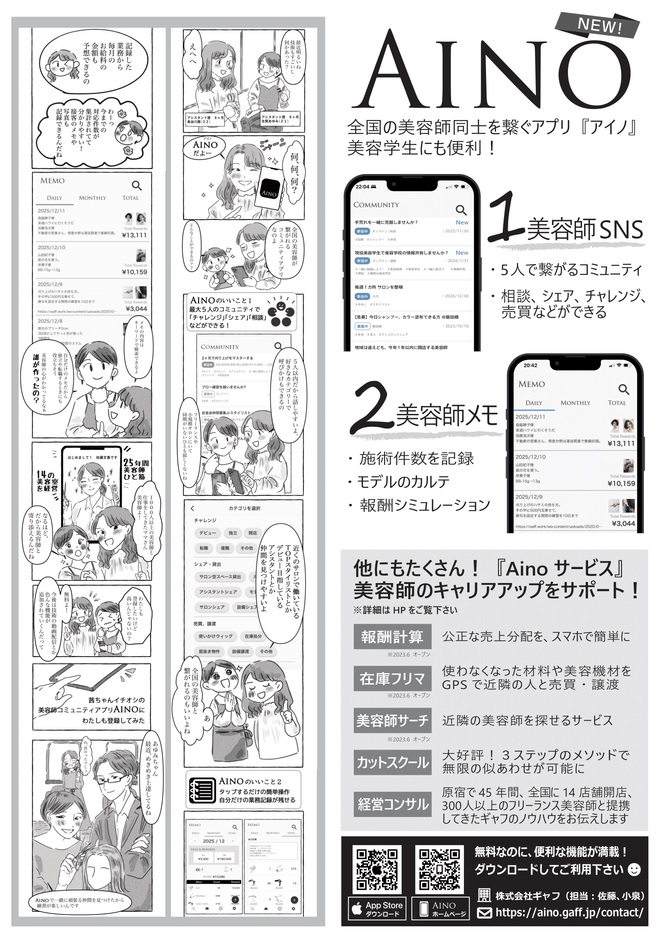 美容室経営・運営コンサルティングを行う株式会社ギャフ(所在地:東京都渋谷区、代表:佐藤 豊)は、美容師向けアプリ&システム『Aino(アイノ)』を、8月8日(火)に提供開始しました。