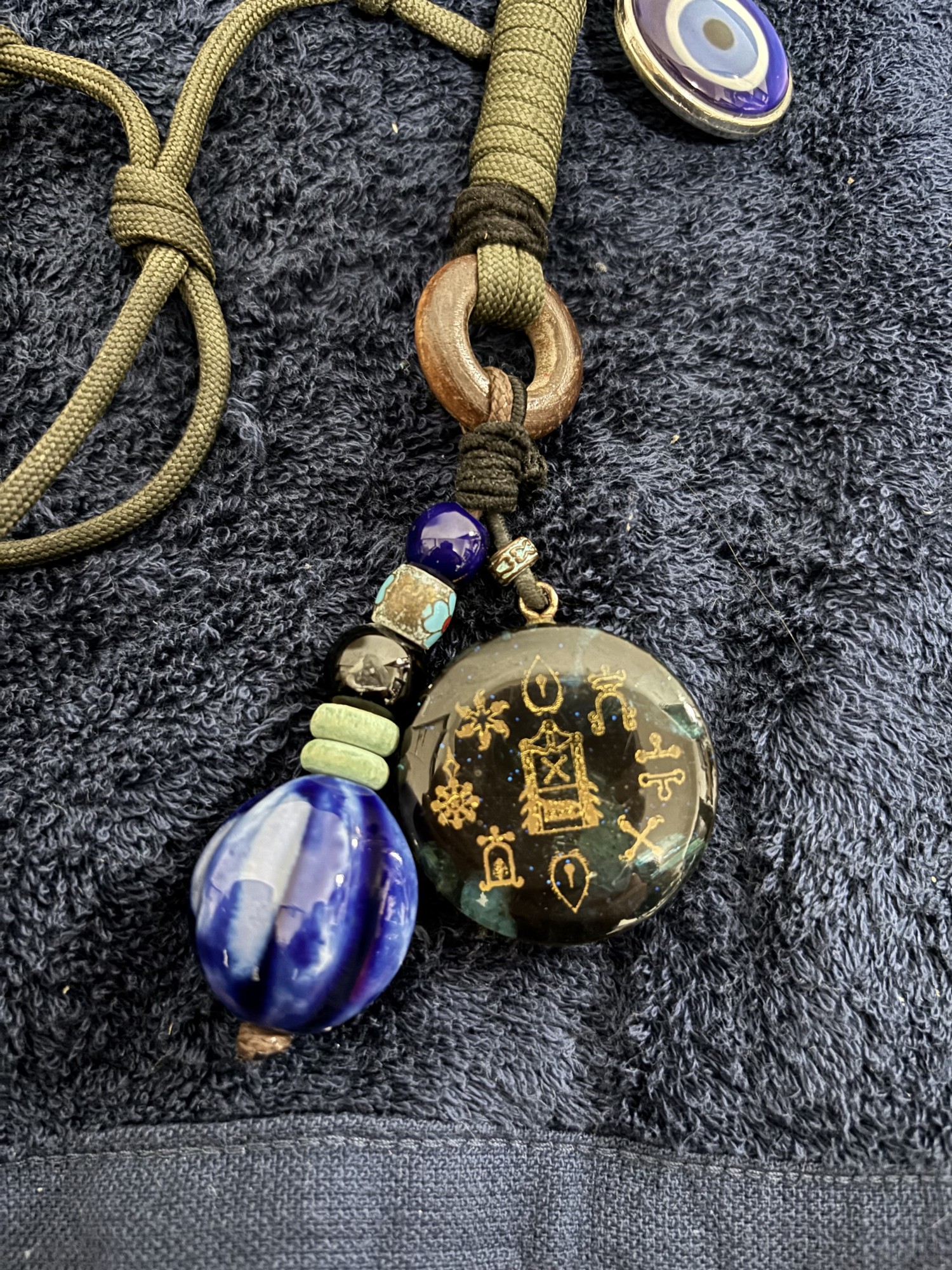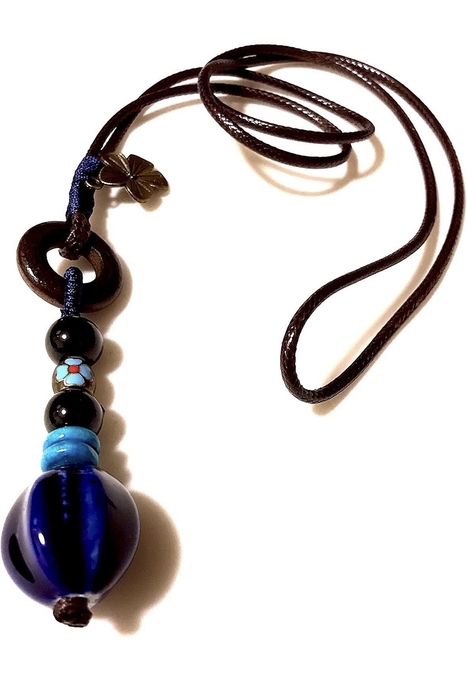 ボヘミアン・エスニック陶器、トルコのナザールボンジュウ(邪視・邪眼…Evil Eye除けの御守り)、日本の十種神宝(とくさのかんだから)・裏面はヤタノカカミの御守りの三種セットのペンダントになります。