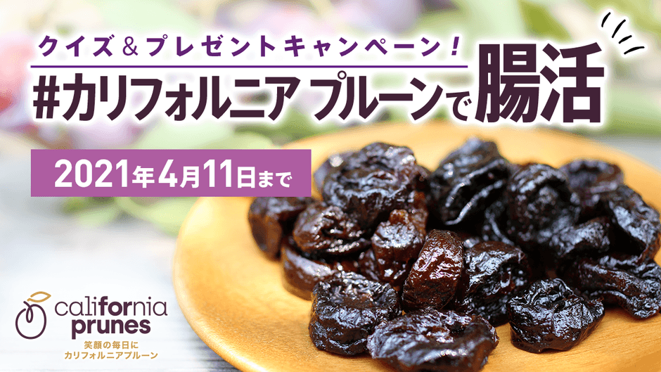 ご存知ですか?カリフォルニア プルーンは、昨今特に注目されている「腸活」に役立つ栄養成分が豊富なナチュラルフードです。皆さまに、カリフォルニア プルーンの栄養や健康効果についてお伝えし、どこにいても手に入る身近な食品で、うれしいことや楽しいことと同じくらい緊張や不安などのストレスも多い春の毎日を健やかに過ごしていただけるようクイズ&プレゼントキャンペーンを行います。