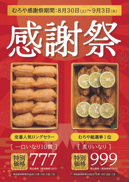 【お得なむろやの感謝祭】8月30日から9月3日まで、期間限定で一口いなりが777円。今年は炙りいなりも感謝祭価格で。