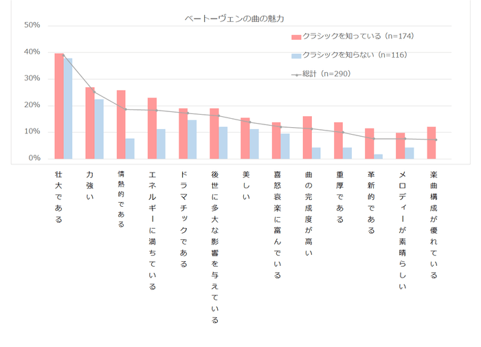 さらに、クラシックの認知度別(『クラシックを知っている』(n=174)「詳しく知っている」「ある程度知っている」の合計、『クラシックを知らない』(n=116)「全く知らない」「あまり知らない」の合計)で聞いたところ、「壮大である」「力強い」はそれほど大きな差はありませんでしたが、「情熱的である」「エネルギーに満ちている」では、『クラシックを知っている』が、知らない人より差を開いて高くなりました。「壮大である」「力強い」は、あまりベートーヴェンの曲を知らなくても何となくのイメージで想定できるかもしれませんが、「情熱的である」「エネルギーに満ちている」はある程度、曲を知っていないと評価できない項目だからかもしれません。