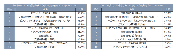 しかし、クラシックの認知度別で聞いてみると大きな違いが見られました。『クラシックを知らない』では、「交響曲第5番「運命」」「交響曲第9番「合唱付き」(歓喜の歌(喜びの歌))」「バガテル(ピアノ小品)「エリーゼのために」」と誰もが知っている有名な曲が上位にきました。