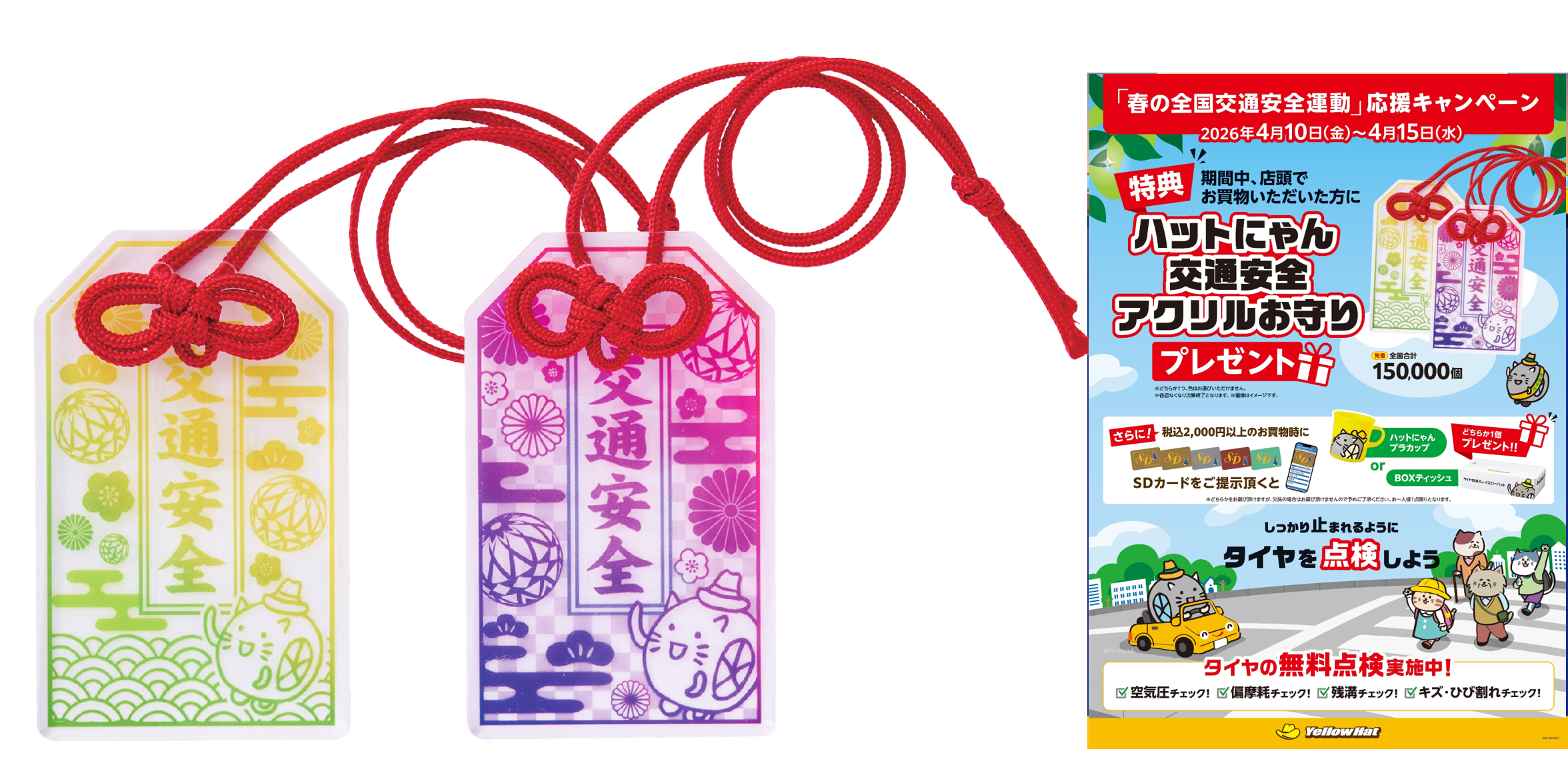 イエローハット店頭では、お客様に快適で安全にドライブしていただくためにセーフティチェックを実施しています。また、キャンペーン中にお買上げいただいた方に「ハットにゃん 交通安全アクリルお守り」を全国合計150,000名様にプレゼントいたします。
