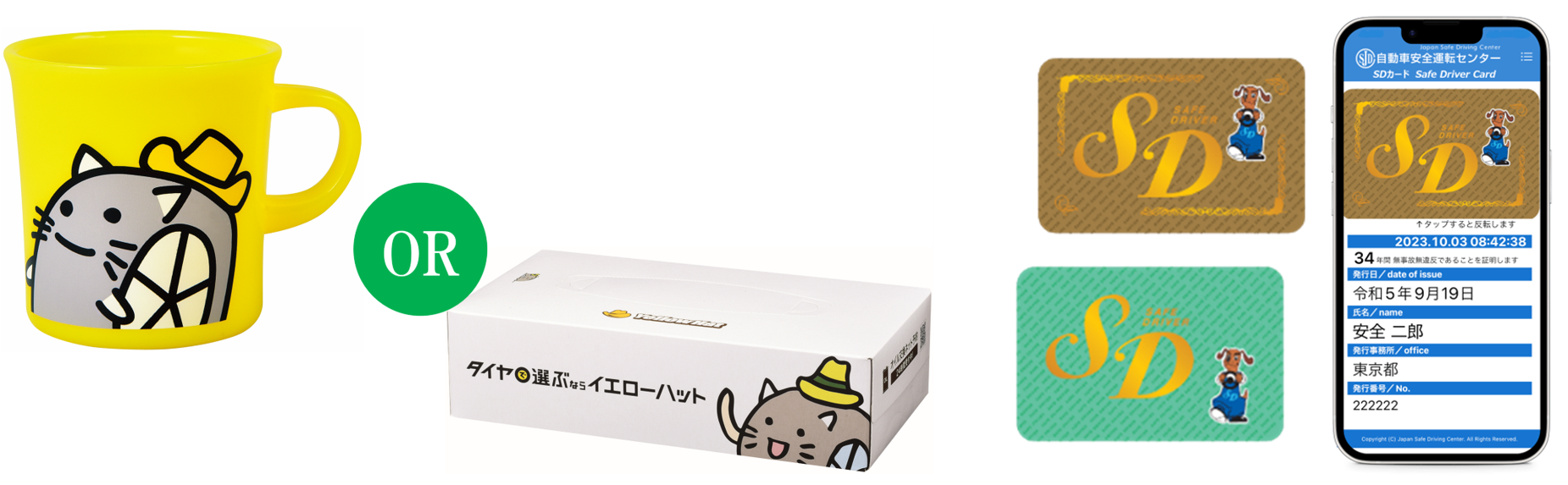 さらに、キャンペーン期間中、店頭で税込2,000円以上のお買物時に「SDカード(Safe Driverカード)」をご提示いただいた方には「ハットにゃんプラカップ」または「BOXティッシュ」をプレゼントいたします。