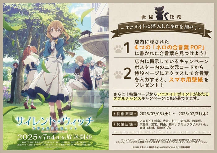 特別企画「極秘任務 ~アニメイトに潜入したネロを探せ!~」が開催決定となりました!アニメイト店内に【ネロの合言葉POP】がいくつか隠されており、見つけた合言葉をキャンペーンポスター記載のQRコードを読み込んで入力すると、各種ビジュアルを用いたスマホ用壁紙をゲットできます!ぜひチャレンジしてみてください。また7月5日(土)よりアニメイト新宿にて「モニカの杖・ローブ」展示が開始となります。ぜひ店頭にてご覧ください。