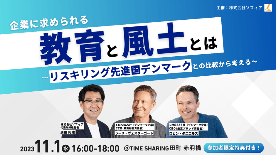 株式会社ソフィア(本社:東京都港区、代表取締役社長:廣田 拓也、URL: https://www.sofia-inc.com/ )は、2023年11月1日(水)にデンマークのラーニングマネジメントシステム(LMS)開発企業のCCOをゲストに迎え「企業に求められる教育と風土とは?~リスキリング先進国デンマークとの比較から考える~」と題し、公開セミナーを実施しました。