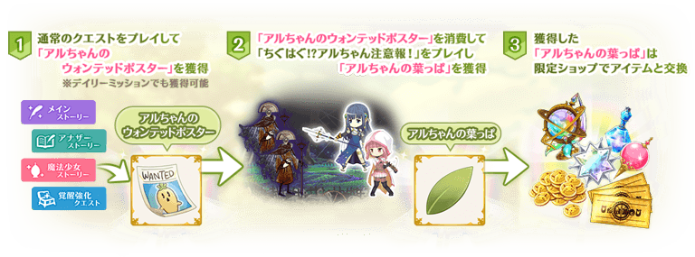 「アルちゃんのウォンテッドポスター」を消費すると本イベントのクエストをプレイでき限定アイテムや覚醒素材と交換できる「アルちゃんの葉っぱ」を獲得できます。