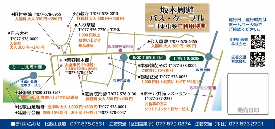 江若交通株式会社(本社:大津市、代表取締役 安積 正彦)と比叡山鉄道株式会社(本社:大津市、代表取締役社長 仁賀 剛)は、坂本地域の観光施設および比叡山へのアクセス性の向上を図るため、バス・ケーブルの1日乗り放題乗車券を発売します。周辺の社寺・施設・店舗の特典も付いたお得な1日乗車券です。