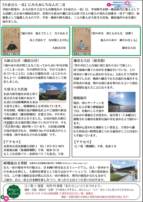 江ノ島電鉄株式会社(本社:神奈川県藤沢市、社長:黒田聡)と京福電気鉄道株式会社(本社:京都市中京区、社長:大塚憲郎)は、2009年に両社で提携した「江ノ電・嵐電姉妹提携」が本年10月に15周年を迎えることに合わせ、東西の古都である鎌倉と京都の観光施設等を1枚のポスター、チラシで紹介し、新しい“こと”を見つけていく共同PR事業「あたらしいコトみつけよう」を実施しています。