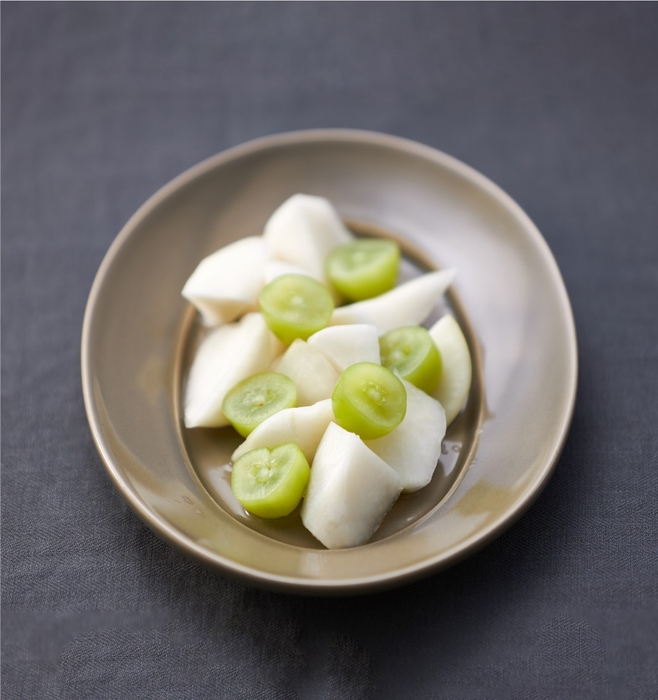 香り高いシャインマスカットとさくさくの皮付き大根を、白ワインベースの甘酢でさっぱりとした浅漬けに仕立てました。