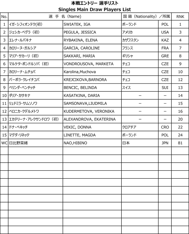 ※上記は最新WTAランキングを反映しておりますが、本戦ダイレクトインの決定は、2023年8月28日付のランキングを適応しています。