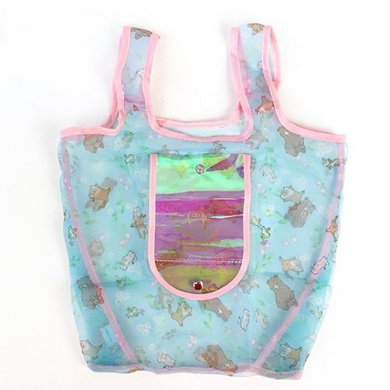 エコバッグには珍しく、オーガンジー素材のエコバッグが登場です。パステルブルーのバッグにカワウソたちのキュートなデザインとともに、ピンクのパイピングが施されたゆめかわ系アイテム♡