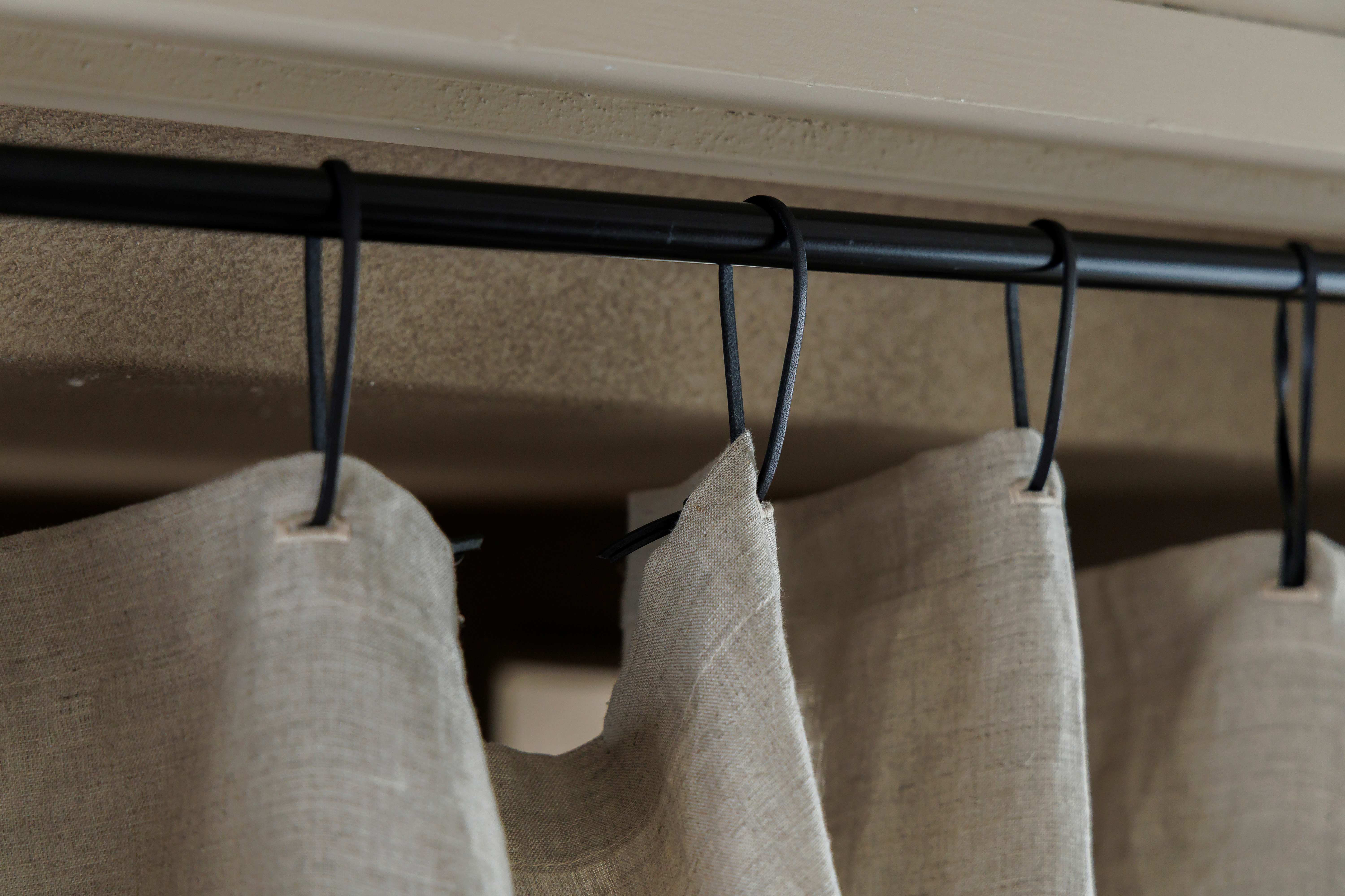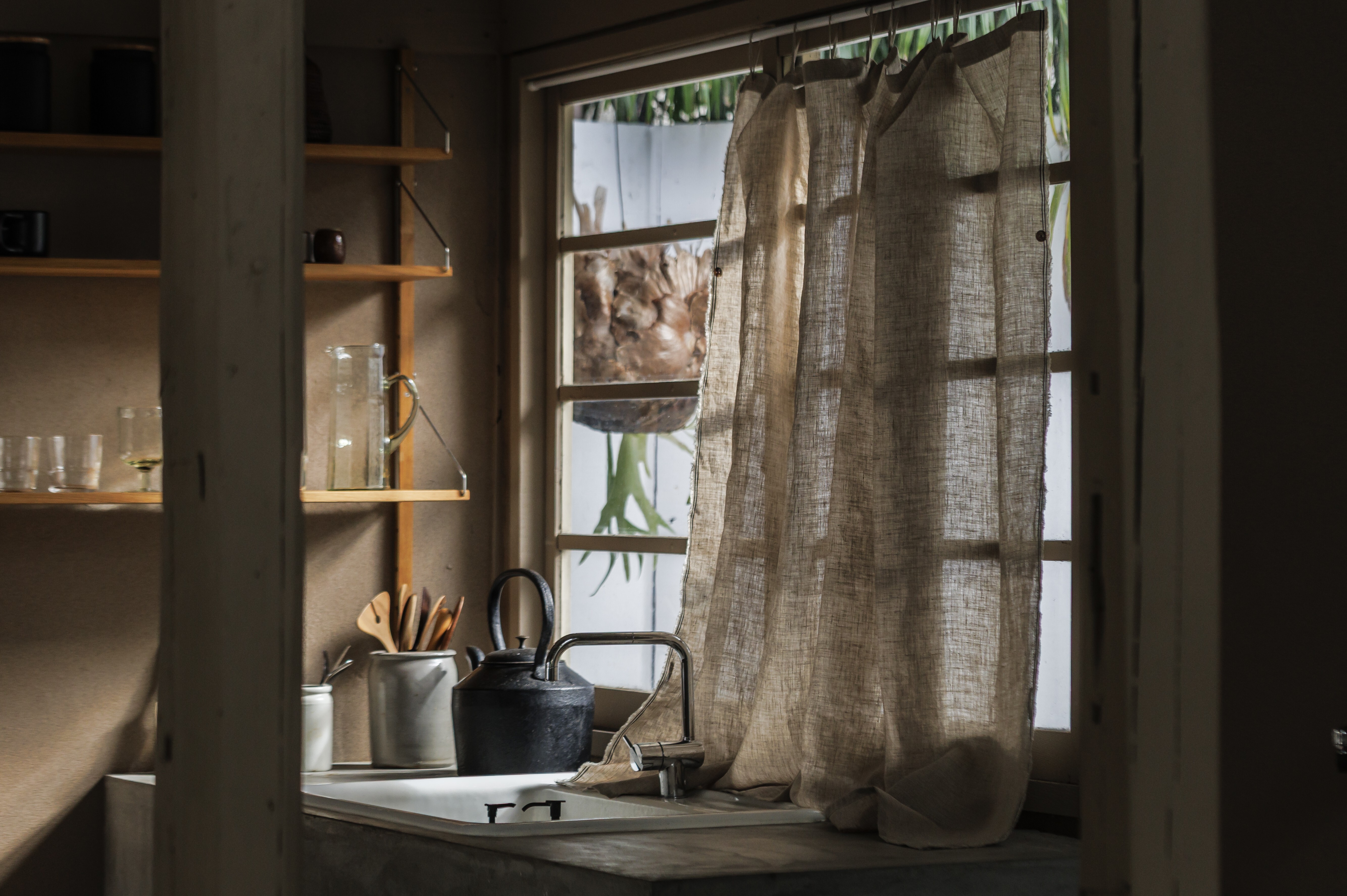廃棄生地ゼロを目指しKURASIKUのカーテンにはプラスチックフックがなく、生地上部に空いた8つのホールに布紐を通して掛けるスタイル(特許取得済)です。使用生地を最小限に抑えるためにヒダやタッセルもなく廃棄生地が出ない製造方法で生産されています。(弊社のオーダーカーテンの製造ラインでは毎日450kg、年間162トンもの生地が廃棄されています。そのためKURASIKUはオーダーではなく既製サイズに限定して生産しています)