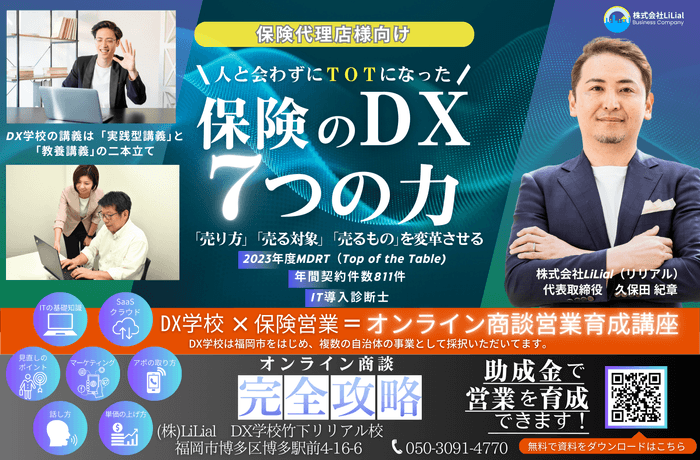 株式会社LiLial【DX学校】竹下リリアル校は、保険営業のデジタルトランスフォーメーション(DX)をテーマにしたオンラインセミナーの第5回を2月14日(水)に実施いたします。
