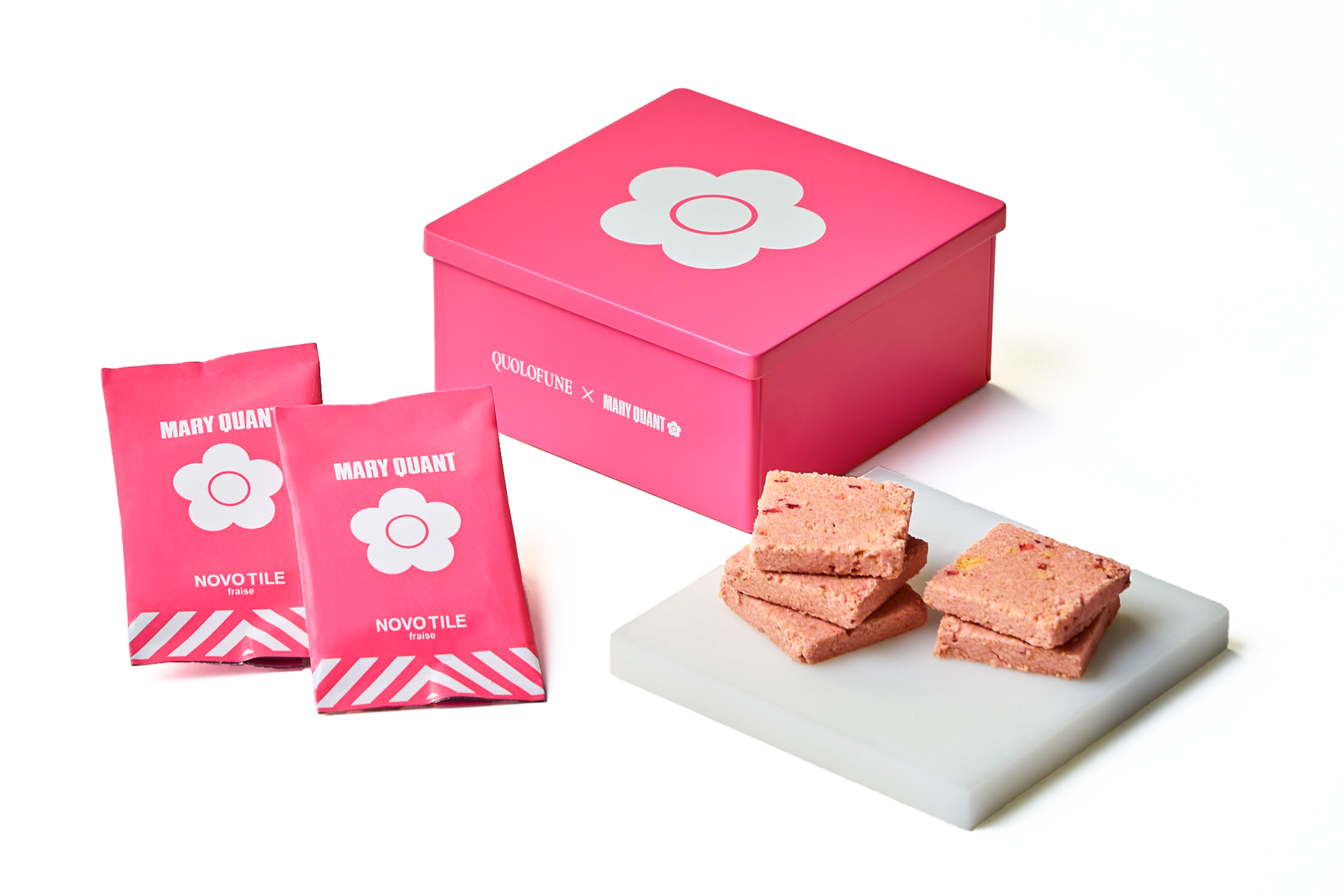 やさしい甘さのチョコレートに細かく砕いたカステララスクと乾燥いちごを混ぜ込み、丁寧に焼き上げました。「ざくっ」「ほろっ」とした食感のノボタイルフレイズは、いちご味の焼きチョコクッキーです。ピンク色が彩やかな「MARY QUANT」とのコラボレーション限定のパッケージは、贈り物をより一層華やかに彩ります。