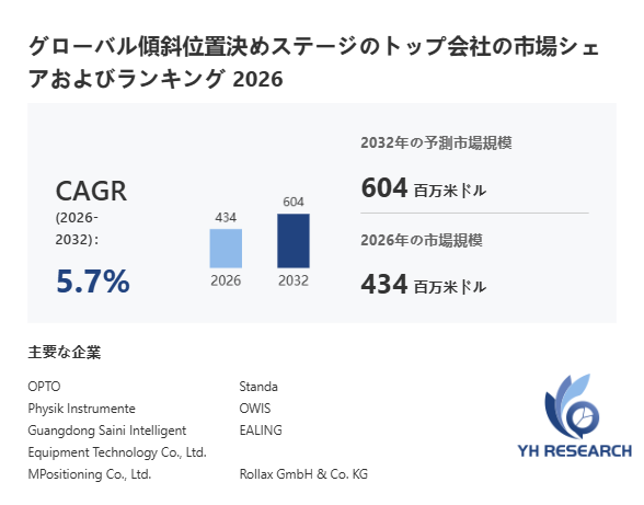 YHResearch調査チームの最新レポート「グローバル傾斜位置決めステージのトップ会社の市場シェアおよびランキング 2026」によると、2026年の434百万米ドルから2032年には604百万米ドルに成長し、2026年から2032年の間にCAGRは5.7%になると予測されています。