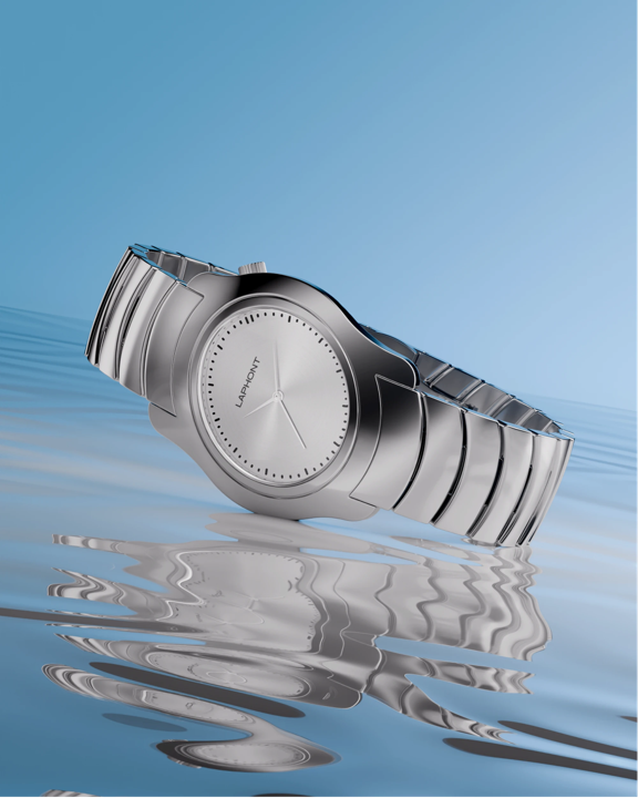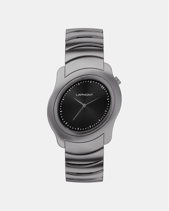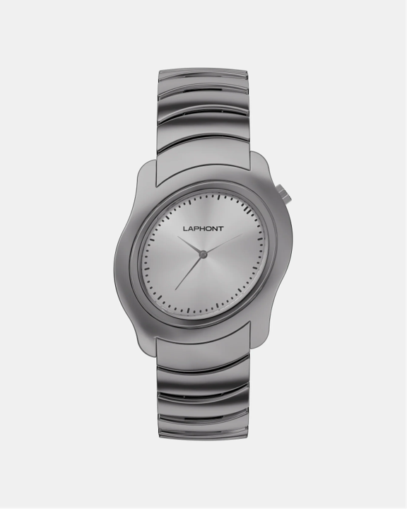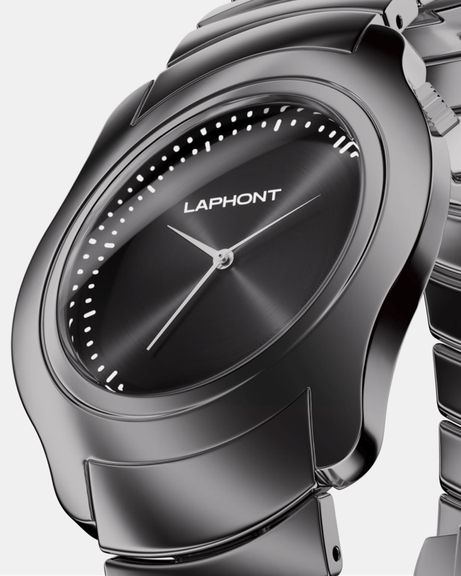 ケースと連続するように設計されたカスタムメタルブレスレットは、静と動のバランスを象徴し、LAPHONTが追求する“構築美としての時計”という哲学を体現しています。