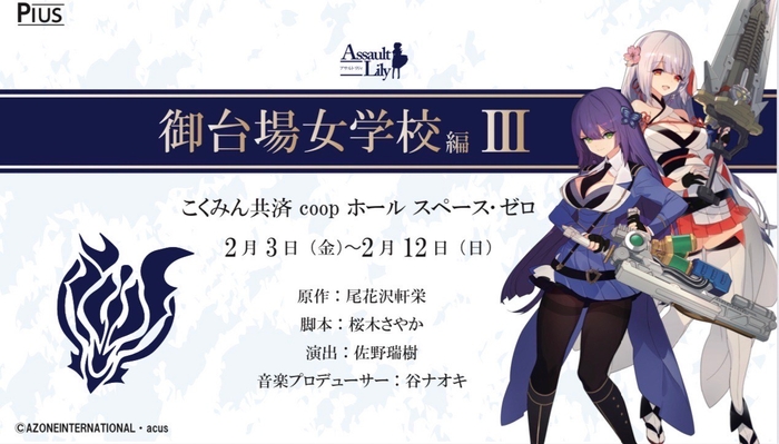 ピウス/アゾンインターナショナル・acus主催、舞台『アサルトリリィ・御台場女学校-The Battle to Overcome-』が2023年2月3日(金)~2月12日(日)にこくみん共済 coop ホール スペース・ゼロ(東京都渋谷区代々木2丁目12-10 こくみん共済 coop 会館)にて上演されます。
