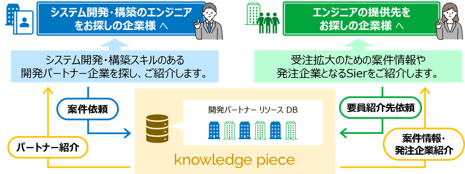 そこで両社の課題をナレッジピースが解決するために「システム開発パートナーマッチングサービス」に取組む事にいたしました。