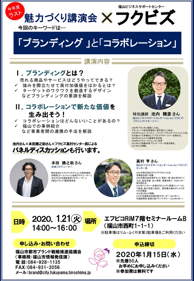 今年度最後の魅力づくり講演会では,福山ビジネスサポートセンターFuku-Biz(フクビズ)から池内精彦氏を特別講師としてお呼びします。これまで数多く事業者さんをサポートしてきたフクビズから,単にかっこいいだけではない“売れる”デザインのポイントや事業者同士のコラボレーションについて解説します。事業者同士の接点の場にもしていただけます。