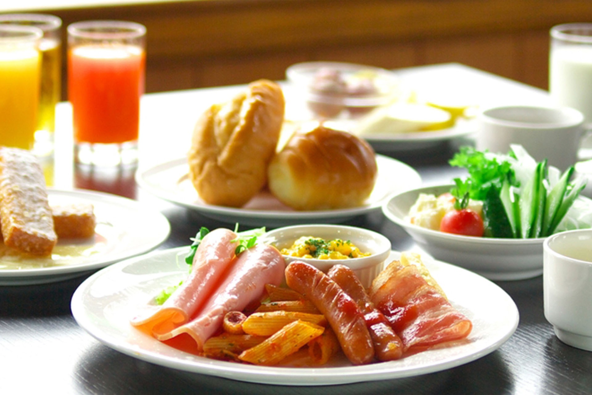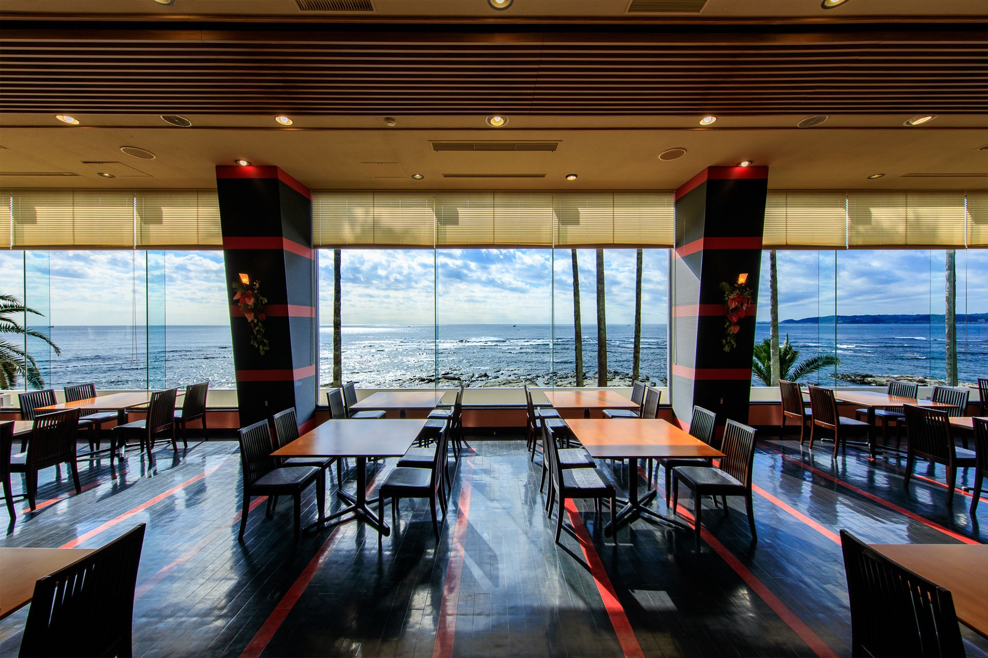 焼き魚、山海漬け、ひじき煮、きんぴらなどの和食に加え、洋食メニューやフルーツも充実。オープンキッチンでは、パンケーキとフレンチトーストを焼きたてでご提供いたします。太平洋を望むレストランで、さわやかな朝のひと時をお楽しみください。