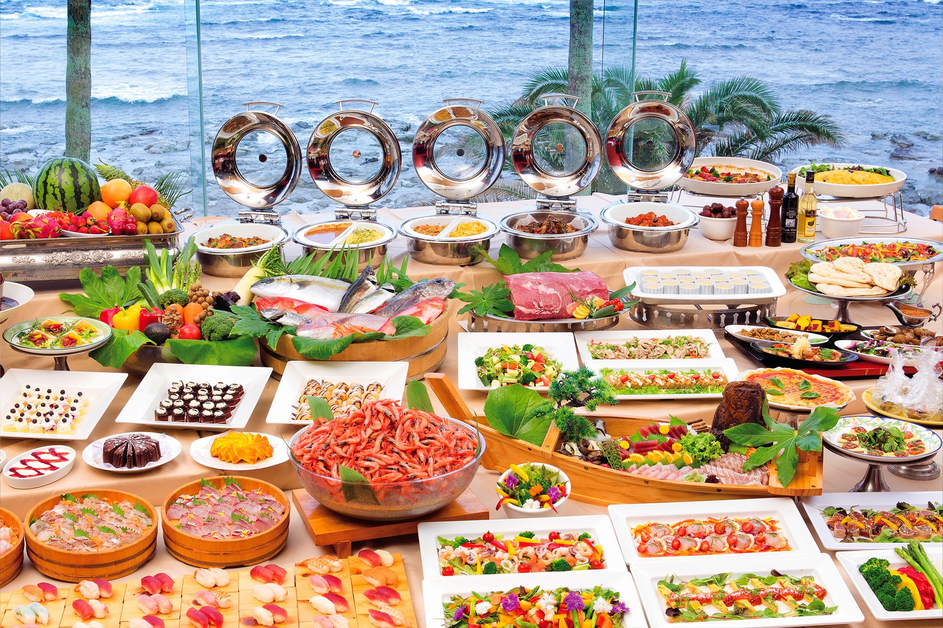 ・海鮮が自慢の約50種類のディナーバイキング。寿司・てんぷらなどライブキッチンも充実