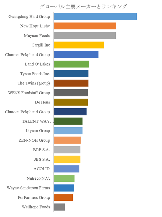 フィード産業は地域ごとに異なる成長ドライバーと市場特徴を示している。中国、米国、ブラジル、インドといった大規模な畜産国が総生産量の大部分を占める一方で、欧州連合はやや安定的で慎重な生産動向を見せている。欧州フィード製造者連盟(FEFAC)は2025年のEU圏内飼料生産が微減で推移するとの見通しを示し、成熟市場としての特性を反映している。これに対しアジア太平洋地域や南米では高い人口増加と畜産市場の拡大がフィード需要を強く牽引し、特に東南アジア諸国では養鶏・豚・水産養殖部門の需要が堅調に伸びている。企業レベルでは、Guangdong Haid Group、New Hope Liuhe、Muyuan Foods、Cargill、Charoen Pokphand Groupといった多国籍プレーヤーがサプライチェーン全体の最適化と研究開発に注力し、競争優位を築いている。これら上位企業は原料調達、製造技術、物流最適化、品質管理、規制対応の全フェーズで差別化を図っている。特に添加物や機能性成分の開発によって生産性と動物健康を同時に促進する取り組みは、品質向上と差別化戦略の中心となる。また、中小の地域密着型企業はローカル市場への迅速な対応と顧客ニーズへの柔軟性を武器として、ニッチ市場での競争力を発揮している。
