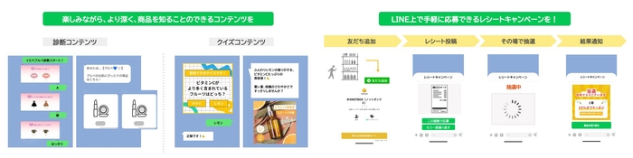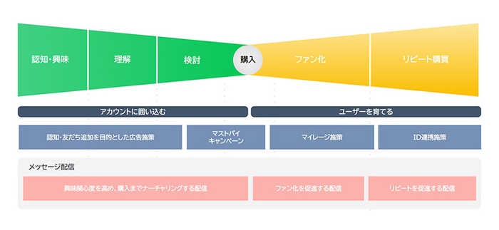 例えば、認知・興味関心段階ではユーザーが楽しみながら、より深く商品を知ることのできる診断コンテンツやクイズなどを配信し、購入の段階では、LINE上で手軽に応募できるレシートキャンペーンを実施するなど、LINE上で可能な具体例も紹介。ユーザーと企業の関係をより強固なものにするためにLINEを有効活用し、ファネル横断型の継続的なマーケティング施策を実施することが重要であると述べました。