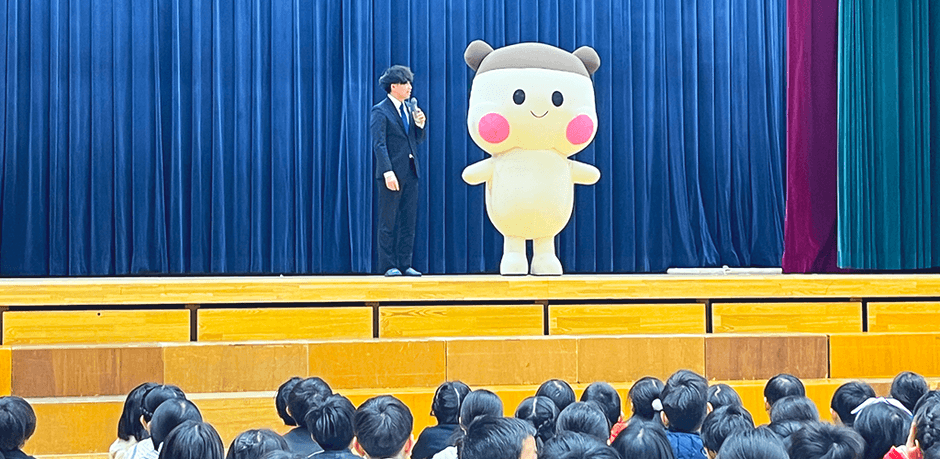 また、本郷専務理事は贈呈式の挨拶において、児童養護施設の現状について簡単な説明を行い、オレンジの羽根募金活動の重要性を強調しました。日本児童養護施設財団の公式マスコットキャラクター「もっち~」の着ぐるみも壇上に登場し、会場は児童の歓声に包まれました。