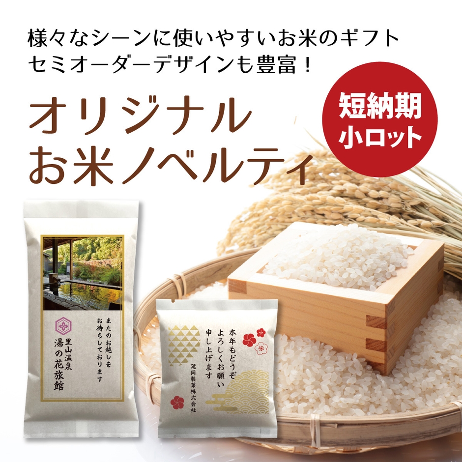 短納期・小ロット・簡単発注!お祝いごとの御礼や、ビジネスのノベルティなど、 様々なシーンで便利に使える、人気のお米のノベルティアイテム