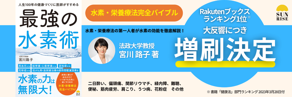 サンライズパブリッシング株式会社(所在地:東京都渋谷区、代表取締役:西潟洸徳、以下 サンライズパブリッシング)は、法政大学人間環境学部・大学院公共政策研究科教授、下北沢西口クリニック院長・宮川路子氏による著書『人生100年の健康づくりに医師がすすめる最強の水素術』(2023年3月2日発売)の増刷決定をお知らせいたします。