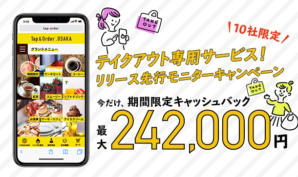 【飲食店向けスマホオーダーシステム】 10社限定!!テイクアウト先行モニターキャンペーン 最大242,000円キャッシュバック!