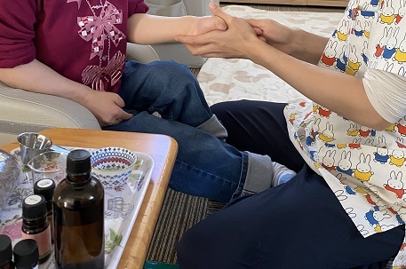アロマで用いられる精油を、足浴や芳香浴等いろんな活動に取り入れ、癒しの効果だけでなく、職員との触れ合いなど、リラックスして過ごしてもらえると考えています。「今日はどんな香りかな?」楽しみに通所していただきたいです。